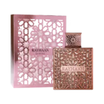Rayhaan Divine es una fragancia oriental floral-gourmand para mujer que inicia con notas frescas y chispeantes de bergamota, jengibre y lichi, evoluciona a un corazón floral de rosa, peonía y vainilla, y se asienta en una base cálida y adictiva de chocolate y pachulí, creando una experiencia sensual y sofisticada con un toque dulce.